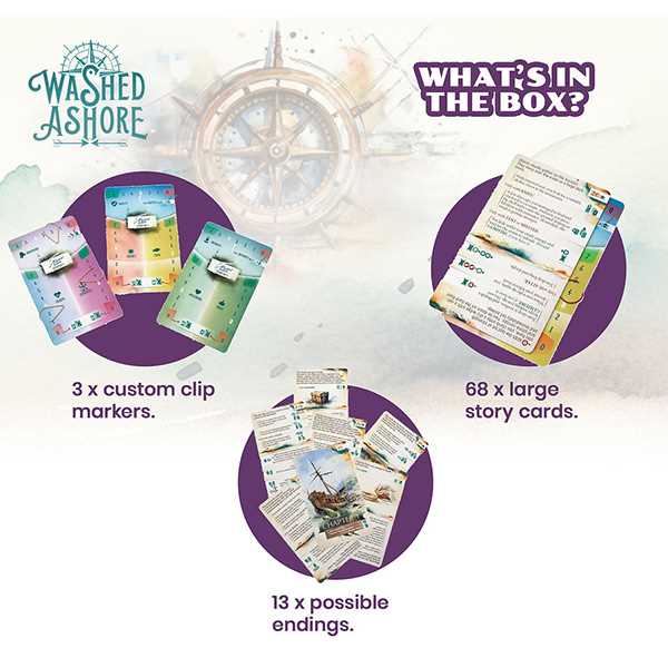 Choose your path, adding and flipping cards in your story, adjusting your character, trying to escape the deserted island. With 13 different endings to explore Washed Ashore is a story that develops depending on your decisions, flip cards for immediate consequences or add them to the back of the deck for later implications. Discover all 13 endings to this adventure!