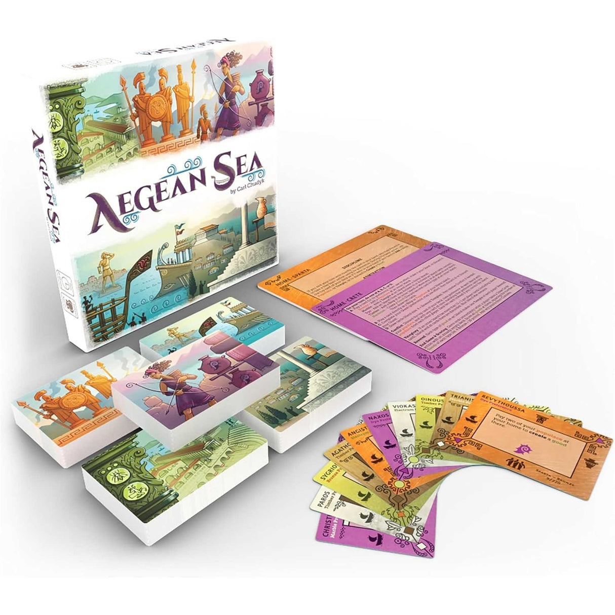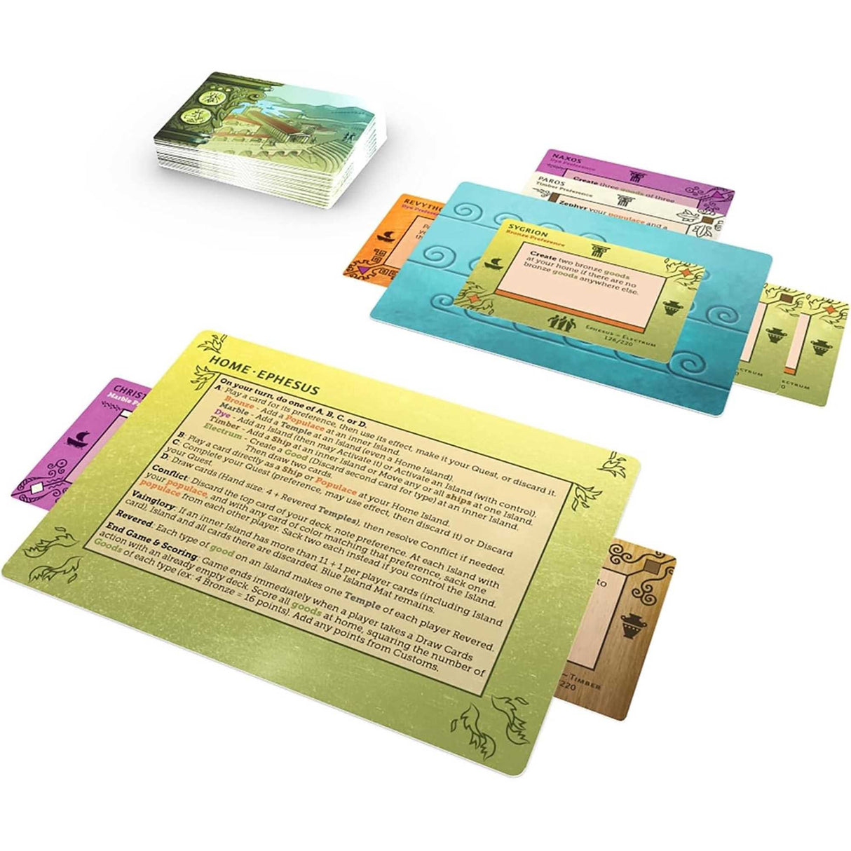 Adventure through the 220 islands of the Aegean Sea in a game in which every card can be an island, or one of the boats, temples, goods, and peoples occupying it. Your ultimate goal is to acquire goods and bring them back to your home island — but of course, all your opponents are trying to do the same! Aegean Sea comes with five different decks representing the Athenians, Spartans, Cretans, Rhodians, and Ephesians. Every card in the game is a unique island in the Aegean, with unique game text. Islands are placed face-up in the middle of the table, and other cards can be tucked underneath to represent boats, temples, goods, and populace (under the left, top, right, bottom edges).