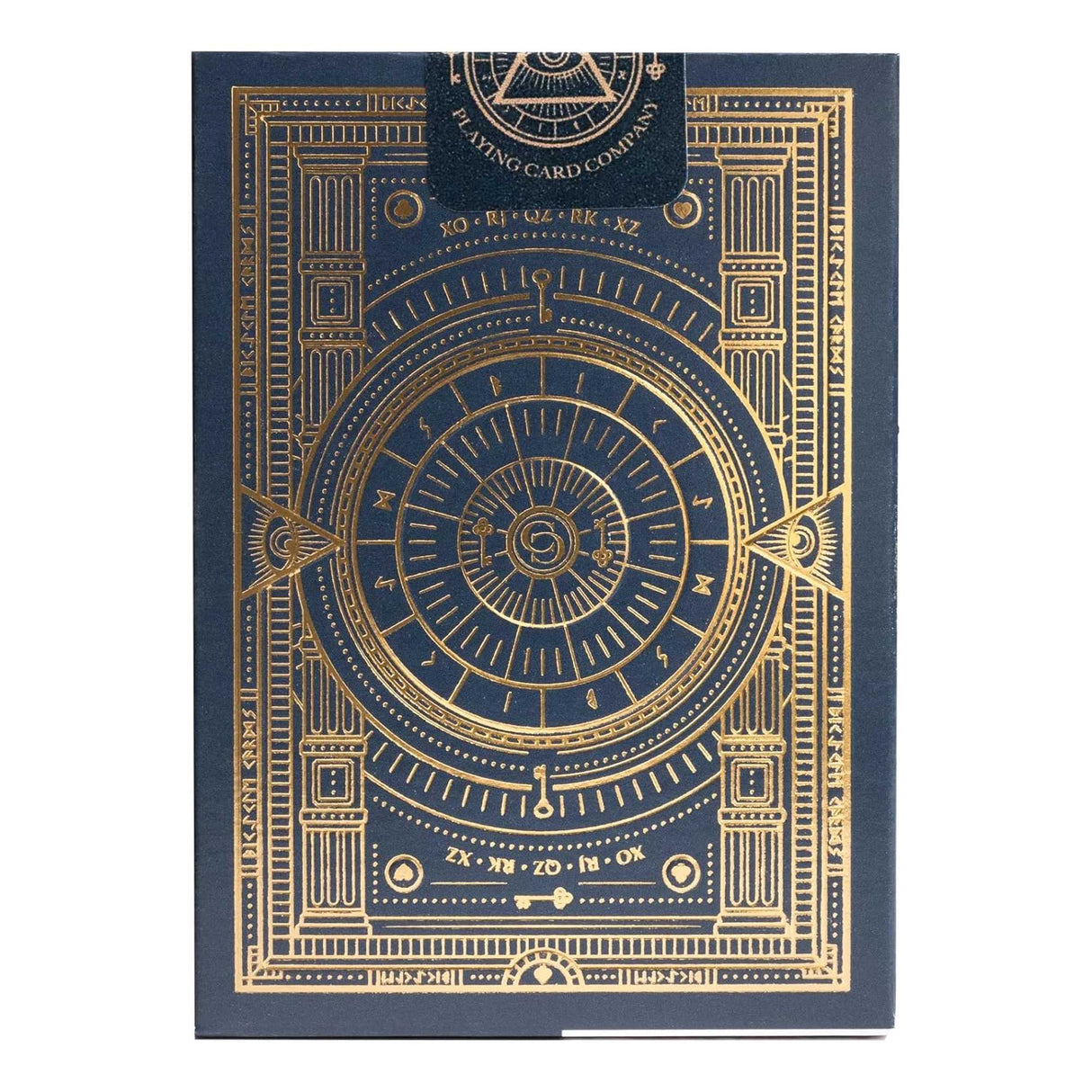 Bicycle Cypher is inspired by the mysterious symbols and cryptography used by historical secret societies. The card backs and faces feature an encrypted message that collectors can decipher. A translation key is included on the ad cards inside the deck. This luxurious deck includes a sophisticated, dark blue tuck, and the inside of the tuck is printed with an elegant key pattern. The intricate linework on the outside of the tuck is hot stamped in gold foil and is accented with embossing.