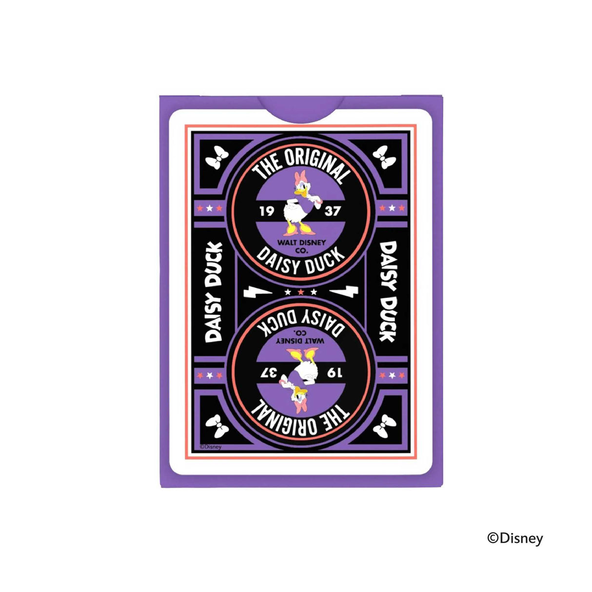 Gather your girlfriends for an enchanting game night! Featuring Daisy Duck's elegance, the lovely lavender spot varnished tuck box plays homage to her signature color. With custom-designed Daisy Duck card backs, this deck promises endless fun and sophistication for your next girl's night!