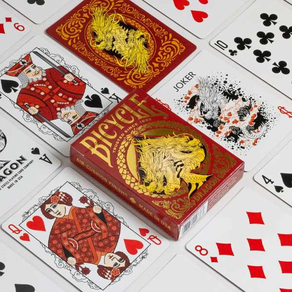 Celebrate strength and good fortune in the Year of the Dragon with Bicycle Red Dragon playing cards!Custom court cards dressed in kimono‐inspired garments will bring a unique flare to your next game; and the brilliant, gold foil framing around the dragons on the tuck case are sure to be show‐stoppers.FEATURESCUSTOM CARD BACK DESIGN – Dual golden dragons against a backdrop of scarlet red.CELEBRATE THE CHINESE ZODIAC – Following a 12‐year cycle, 2024 is the first year of the dragon since 2012.