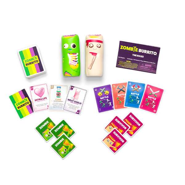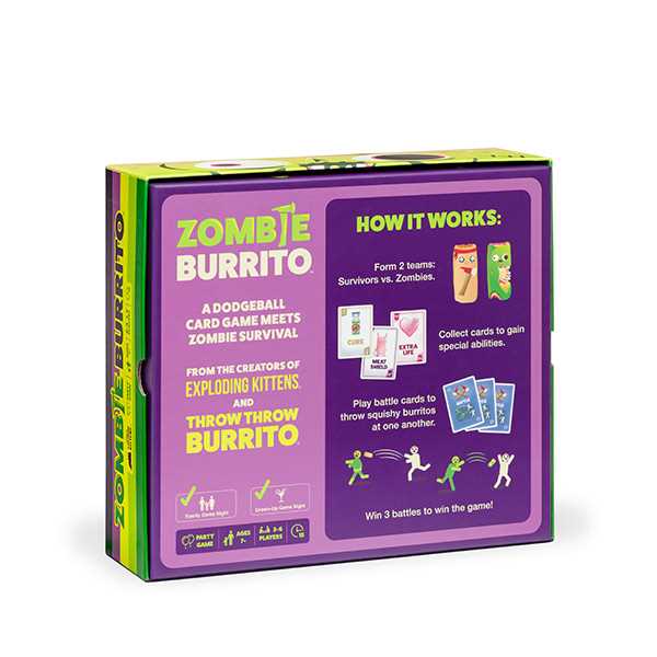 PITTING THE LIVING AGAINST THE UNDEAD IN AN EPIC SHOWDOWN- Pick your side in this ghoulish twist on the Throw Throw Burrito game. Survivors and Zombies face off in a battle of wits and reflexes that's thrilling for the whole family.THRILLING ZOMBIE DODGEBALL GAMEPLAY- Collect beneficial cards while dodging dreaded Battle Cards. When 3 Battle Cards are played, a frenzied brawl erupts between Zombies and Survivors. Heart-pounding excitement for kids and adults.