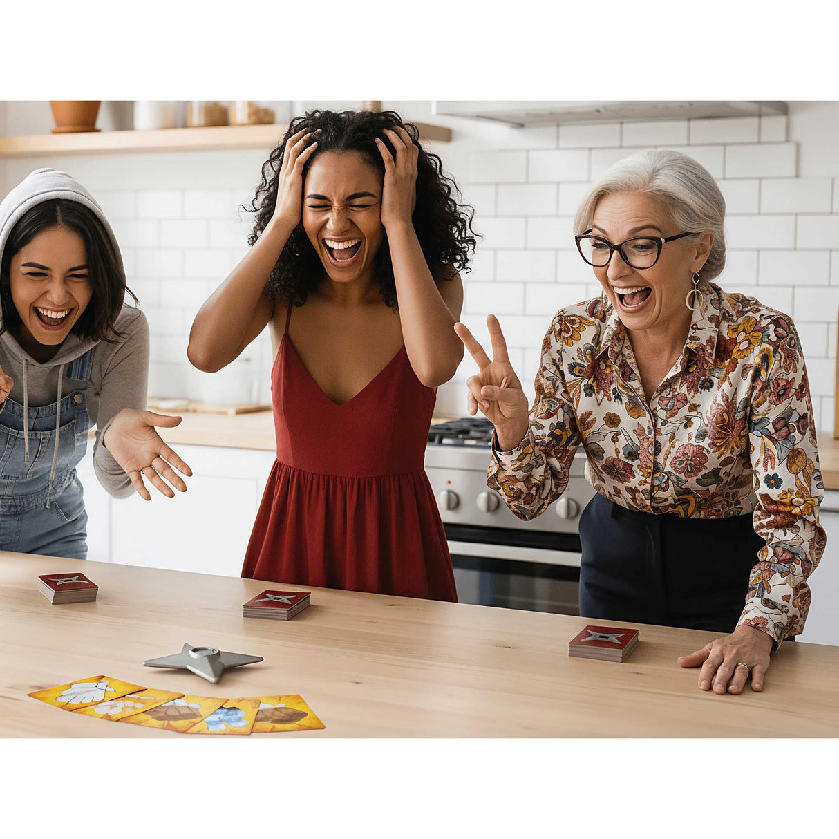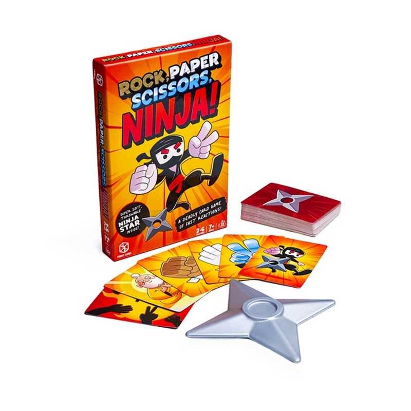 A fast-paced card game combining traditional Rock, Paper, Scissors with ninja-themed action and quick reflexes. Includes a super soft, throwable ninja star accessory that adds an exciting physical element to the traditional card game format! Players must react quickly to special cards - bowing to Sensei cards and grabbing the ninja star when ninja cards appear.