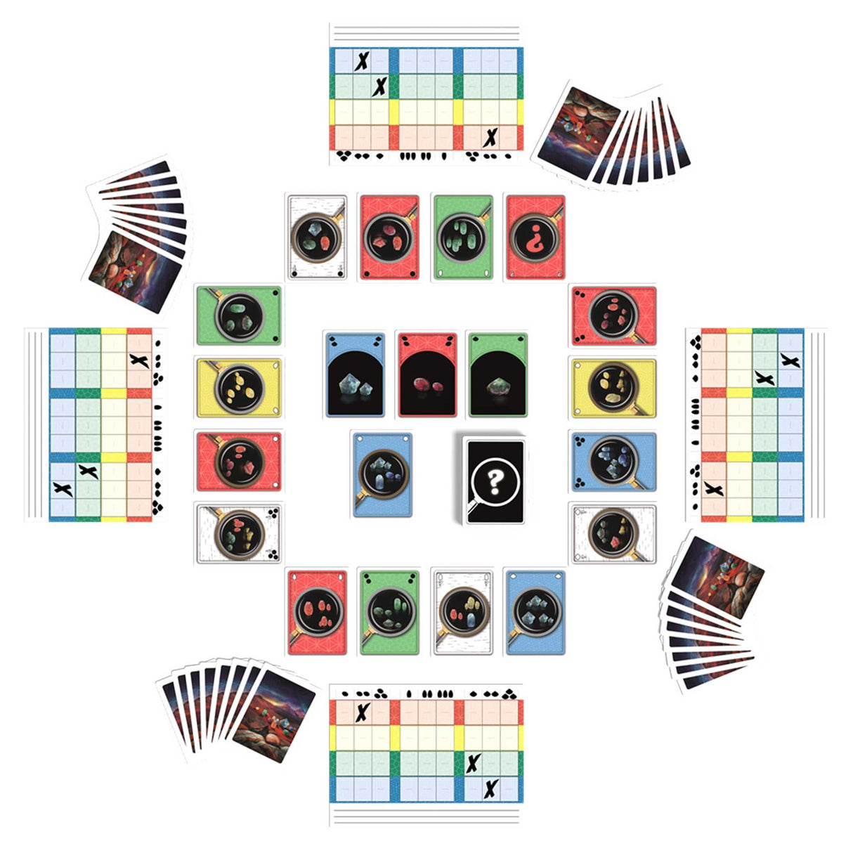 Sleuth is the timeless classic deduction game by legendary designer Sid Sackson. Players are searching for a missing gem, one of the 36 Gem cards which has been removed and hidden before the start of the game. The 35 remaining Gem cards are distributed among the Players, with extras publicly displayed. Using logic and deduction, and cards from the Search deck, players question their opponents for evidence as they race to win by being the first to identify the missing gem.