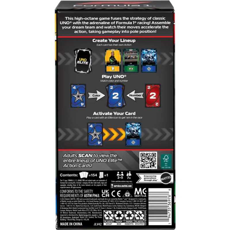 This high-octane UNO Elite Formula 1 card game fuses the strategy of classic UNO with the adrenaline of Formula 1 racing! The excitement starts with a full deck of 112 UNO cards and picks up speed with 40 randomized Formula 1 Elite Action Cards (in four Game Booster Packs) and two Promo Cards. UNO Elite NFL plays like classic UNO, but actions like Skip and Reverse are found on the Elite Action Cards. Each Elite Action Card comes with its own special power that activates when a game player plays a card with an Elite icon on it. And when down to the last card, don’t forget to yell “UNO!” The racing-themed game makes a thrilling gift for Formula 1 fans and card game lovers ages 7 years old and up. Colors and decorations may vary.