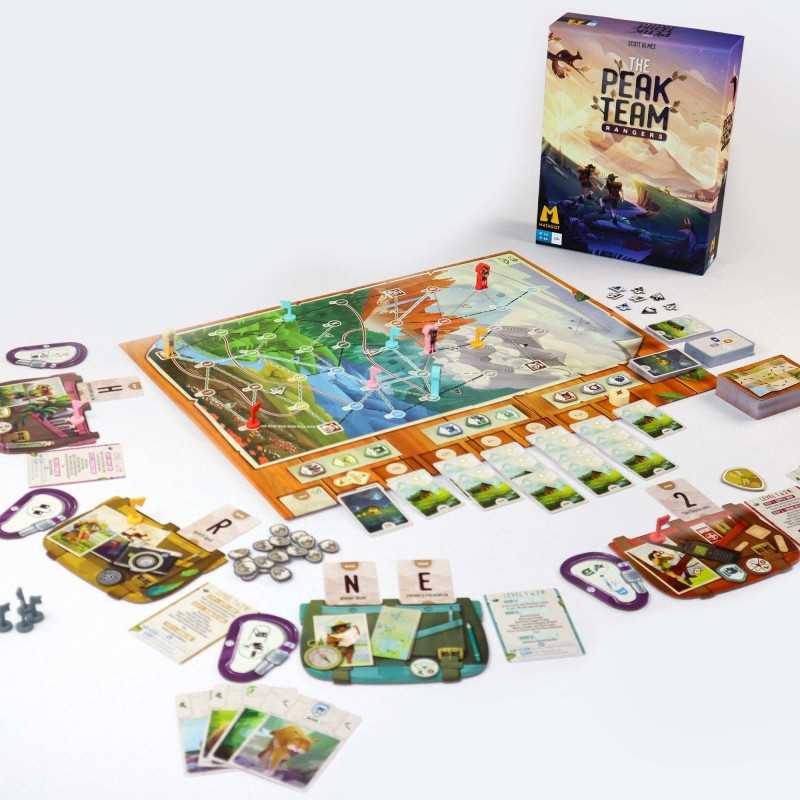 In The Peak Team, a cooperative game by Scott Almes based on an inventive draft mechanism, 1 to 5 park rangers work together to explore the reserve, care for the animals, and complete their missions—before they run out of actions!