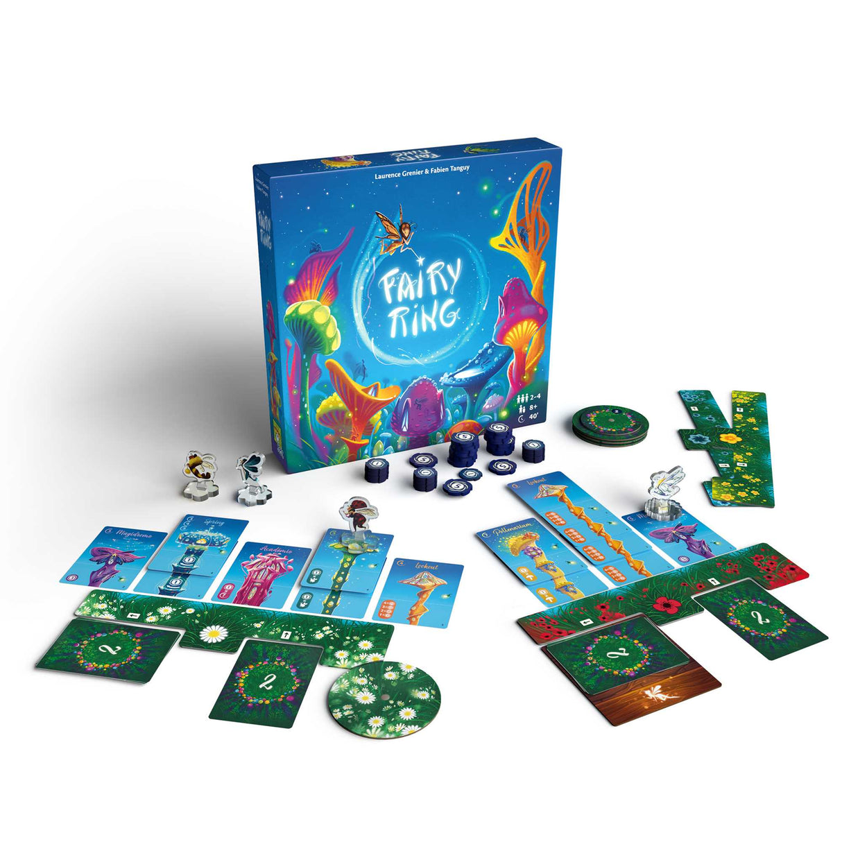 A ray of moonlight shines in the clearing. The fairies wake up and stretch their wings. Mushrooms pop up from the ground, forming a circle. The first fireflies start to land. Magic is returning to the forest; now it’s time to prepare for winter… Enter the magical world of Fairy Ring! Create a mushroom village to house the fairies in the clearing. Guide your fairy carefully, from village to village, through the fairy ring to gather as much Mana, the magical energy of fairies, as possible. You have two seasons to develop your village before winter comes. Each decision counts towards winning the game!