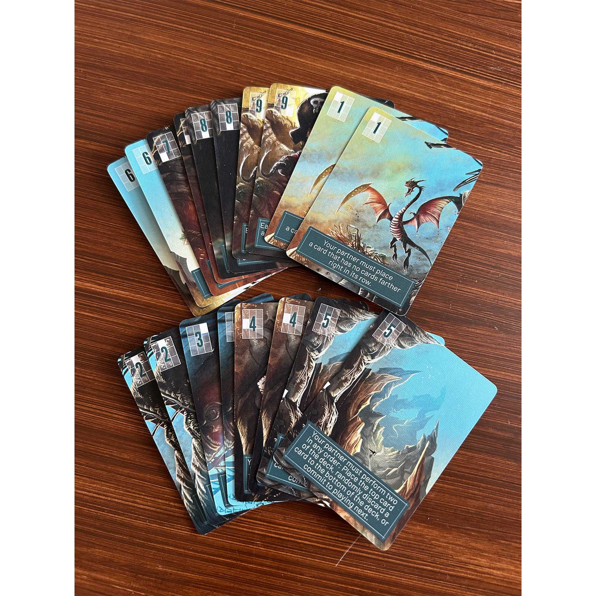 Smitten's core design was inspired by comic book cards from Jamey’s youth, specifically a set where various cards formed a cohesive 9-card panorama image. In trying to complete two of these images in Smitten, there is no set turn order; rather, players indicate a preference to play or not play a card. The played card has instructions for the other player to place a card, which they must do or the game instantly ends.