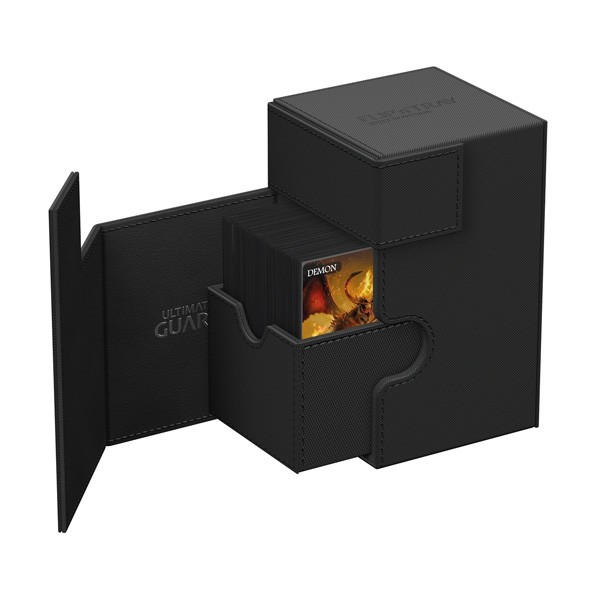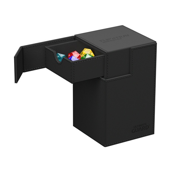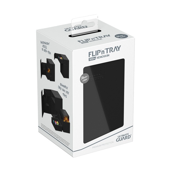 The quintessential Ultimate Guard deck box: a timeless monocolored design with strong magnetic closure, card and dice trays for safe storage of your deck, and a resistant but smooth Xenoskin surface. Looking for additional safety? With room for 100 double-sleeved or 120 single-sleeved cards in standard size, the Flip'n'Tray 100+ has it all.