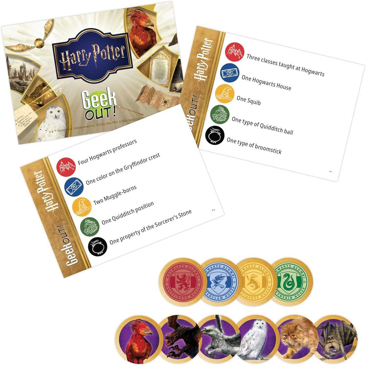 Geek Out®! Harry Potter™ lets fans boast their expertise in magical topics to win. A six-sided die determines which of the five magical categories the question will address. The categories are At Hogwarts, the Four Houses, Witches and Wizards, In the Wizarding World, and Miscellaneous. After the prompt is read, bidding begins for the most examples a player or team can provide for it. What would you bid on these topics: Characters who look in the Mirror of Erised? Letter grades at Hogwarts? Locations traveled to by portkey? Geek out on 600 Wizarding World trivia topics - this award-winning trivia party game takes the magic to a whole new level. Find out once and for all which Harry Potter fan is the most knowledgeable. Categories include At Hogwarts, The Four Houses, Witches and Wizards, In the Wizarding World and Miscellaneous.