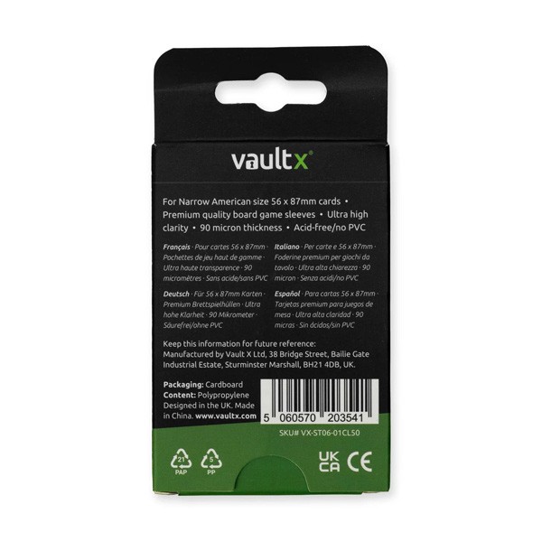 Keep your board games protected and extend the lifespan of your favourite titles with Vault X premium board game sleeves. Featuring excellent shuffle feel and premium 90 micron thickness, these 58 x 89mm sleeves are suitable for Narrow American sized cards up to 56 x 87mm.